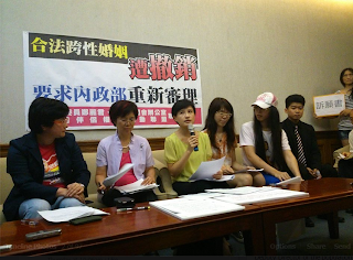 Partnership Rights, Yu, Mei-Nu Legislator, Cheng, Li-Chiun Cheng Legislator, partners Jiyi Wu a physics and mathematics specialist and Abbygail Wu (hat) computer engineer, Yu ji Spokesman for ISTScare Taiwan and Xu, Bai-Xing supporter.
