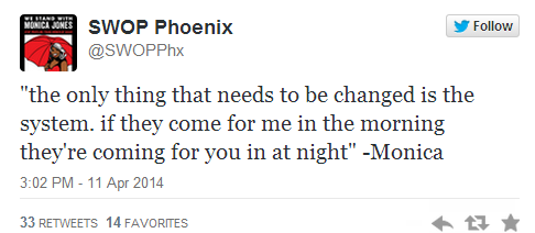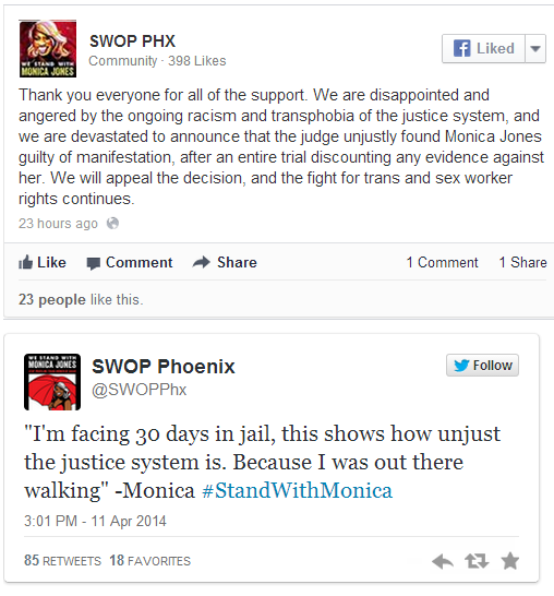 In light of this devastating ruling, SWOP Phoenix (Sex Worker Outreach Project) and Monica Jones will fight the case in an appeals process, while building national and international momentum against unjust policies that target trans women, people of color, and sex workers. SWOP Phoenix is calling on people from around the country to keep demanding justice for Ms. Jones. Meanwhile, the UN Special Rapporteur on Human Rights Defenders is monitoring the trial as an example of discriminatory policing and retaliation on activists organizing for human rights.