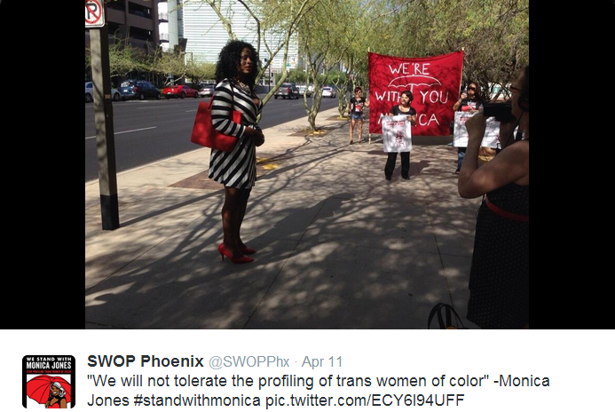Just days after Monica Jones was shown in this video protesting the failed religious discriminatory law in Phoenix, she was offered a ride while walking to a bar. The driver turned out to be an undercover police officer who then arrested her for “manifestation of prostitution’.