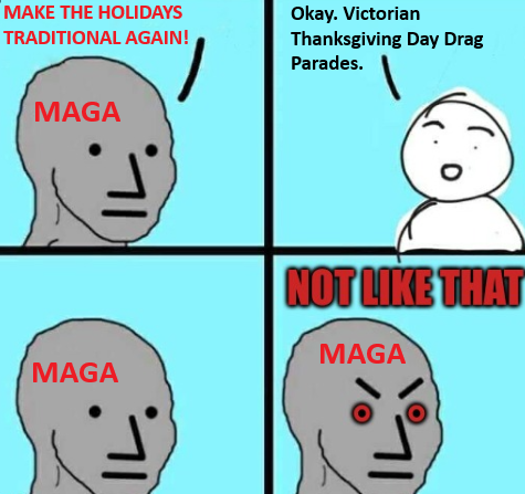 I, for one, agree with the political Right; the Left needs to care more about the traditional aspects of the Holiday season. So, the first thing we need to do is return the NYC Thanksgiving Day Parade to its Victorian roots as a drag queen parade.