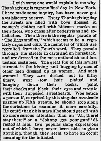 Every Thanksgiving day the streets are filled with boys dressed in women’s clothes and with hideous masks on their faces, who chase after pedestrians and solicit alms. Then there is the regular parade of “The Ragamuffins,” which seems to be a regularly organized club, the members of which are recruited from the Fourth ward. They parade through the streets in carts and on horseback, and are dressed in the most outlandish and fantastical costumes. The great fun of this lawless turnout is the kissing and hugging by men of other men dressed up as women. And such women! They are decked out in filthy plaited and backs, their cheeks and black their eyes and wrestle with their supposed sweethearts. Woe betide a person if, surprised by this singular cavalcade passing up Fifth avenue, he should stop along the curbstone to examine it more carefully. He could thank his stars if he should get off with no more serious attention than an “Ah, there! stay there!” or a “Johnny get your gun!” directed at him, two popular slang expressions out of which I have never been able to glean anything, thong they seem to have an occult meaning for the initiated.