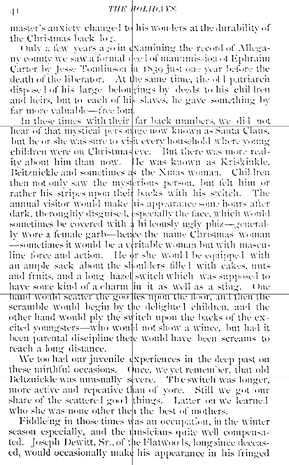 He was known as Kriskinkle, Beltznickle, and sometimes as the Christmas woman. Children then not only saw the mysterious person, but felt him or rather his stripes upon their backs with his switch. The annual visitor would make his appearance some hours after dark, thoroughly disguised, especially the face, which would sometimes be covered with a hideously ugly phiz – generally wore a female garb – hence the name Christmas woman – sometimes it would be a veritable woman but with masculine force and action. He or she would be equipped with an ample sack about the shoulders filled with cakes, nuts, and fruits, and a long hazel switch which was supposed to have some kind of a charm in it as well as a sting.