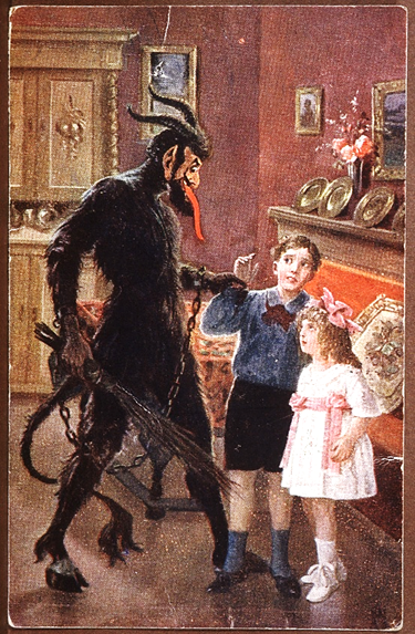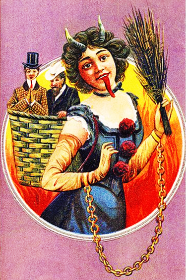 Before Christianity came for Alpine region winter traditions, there was a winter goddess, Perchta, who had two gendered aspects: the female Frau Perchta and the male Quantembermann. As Christianity was spread at the point of a sword throughout the Alpine region, the lore became that Perchta, now demonized, was enslaved and was recast as Krampus.