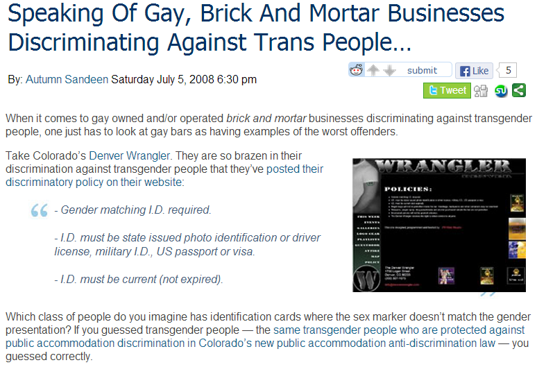 This was not the first time the Wrangler has been called out on transphobia. Autumn Sandeen posted about this bar while while trying to find a trans friendly watering hole for a upcoming visit to Denver on Pams House Blend in 2008.