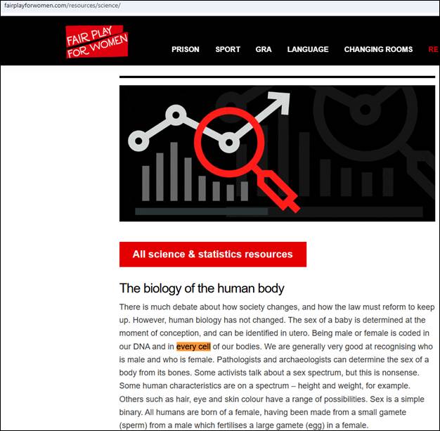 Here, the hate group is appealing to the chromosomal DNA in cells. Human erythrocyte, thrombocyte, keratinocyte, lens fiber cells, and unintentionally ironic to the hate group’s point, spermatozoa (which have no cellular chromosomal DNA) are not sexed cells. None of these human cells contain their own chromosomal DNA.